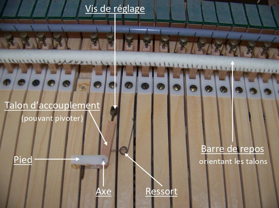 Elles sont fixées sur la queue des touches du clavier inférieur, et parfois munies d’une vis de réglage à leur extrémité.