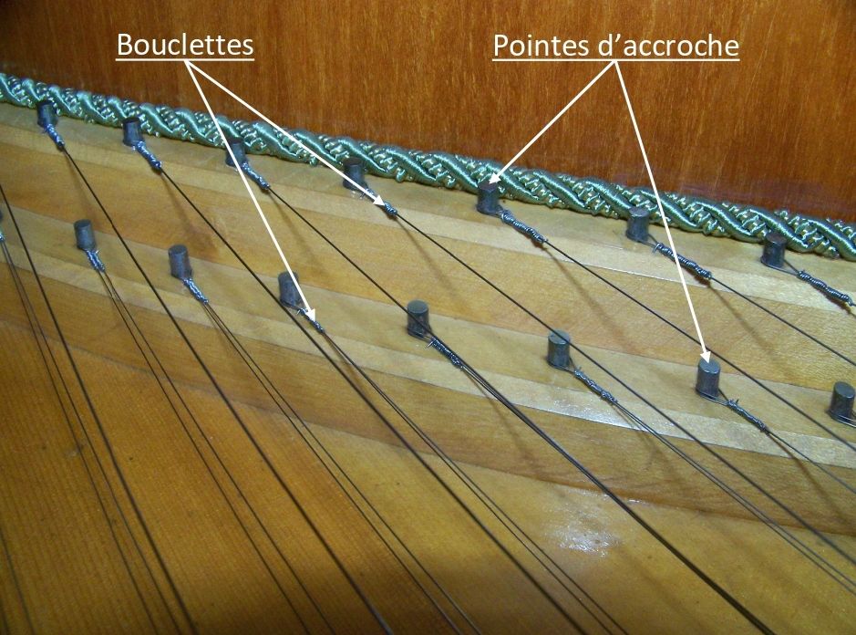 L’une de leurs extrémités est enroulée autour des chevilles d’accord, et l’autre, attachée aux pointes d’accroche – plantées dans le cordier ou la barre d’accroche – au moyen d’une bouclette.