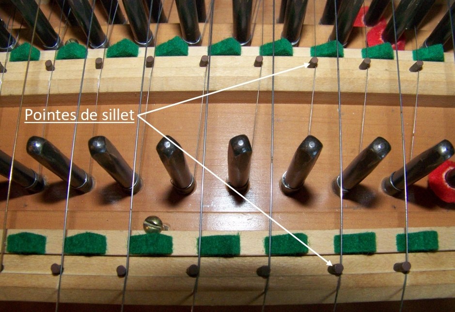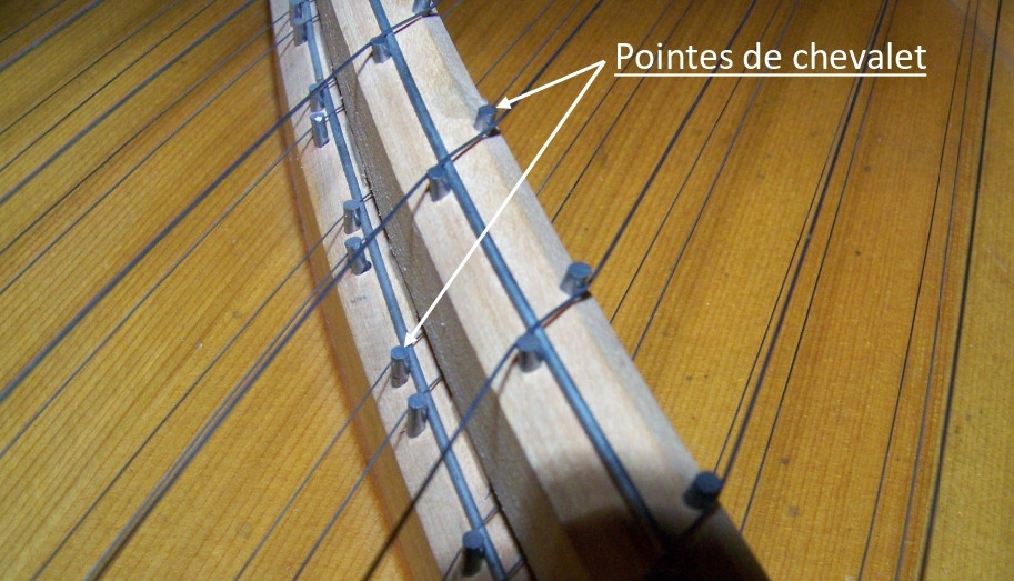 Elles reposent sur le sillet et le chevalet maintenues et guidées par des pointes plantées dans ces derniers.