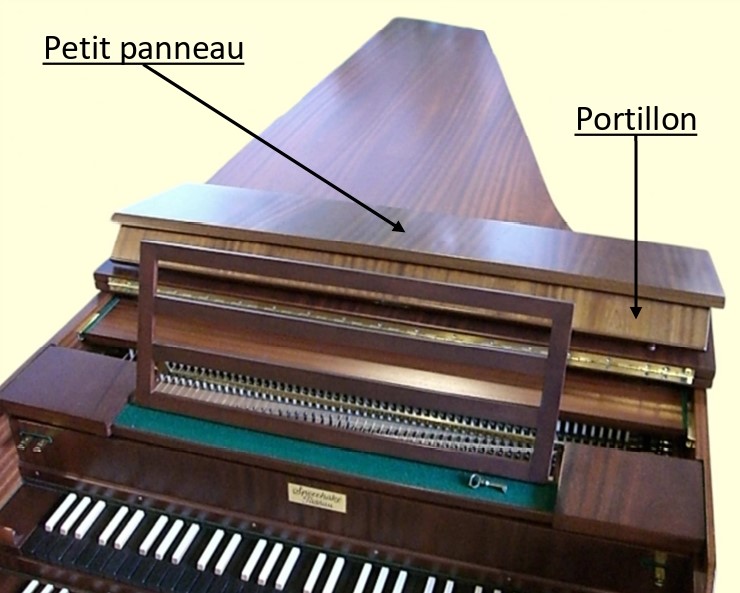 Dans les instruments modernes, le portillon est systématiquement fixé par des charnières ou collé au petit panneau.