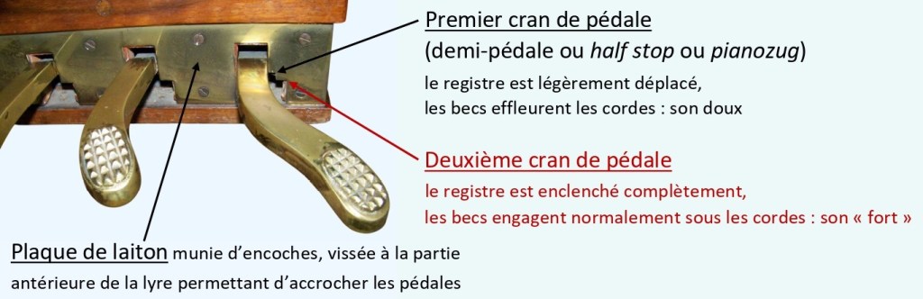 Dans ce cas, la lyre comporte en sa partie antérieure deux crans permettant d’accrocher la pédale à deux niveaux différents :